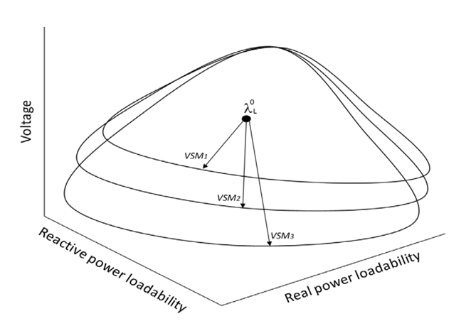 Fig. 4 shows three-dimensional curves used to display the voltage changes according to the variation of the real and reactive powers of loads and generators. The regions can be created for a load bus, different loads in an area, or the entire system. This figure illustrates the operating point λ0L in the stable region, the different voltage boundaries, and multiple critical VSLs in different layers, which represent the risk of operation. VSM1 is the voltage stability margin measured from the operating point to a maximum point in layer 1, VSM2 is the voltage stability margin measured from the operating point to a maximum point in layer 2, and VSM3 is the voltage stability margin measured from the operating point to a maximum point in layer 3. Multiple layers with all the VSLs can also be determined by the algorithm to evaluate the risk of different changes in the power system.
