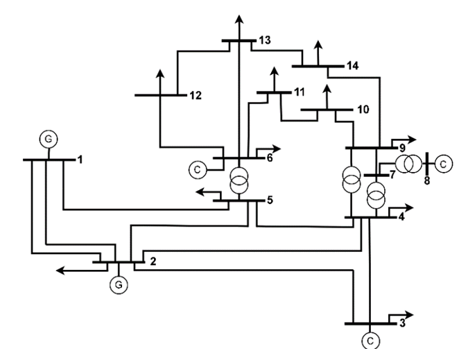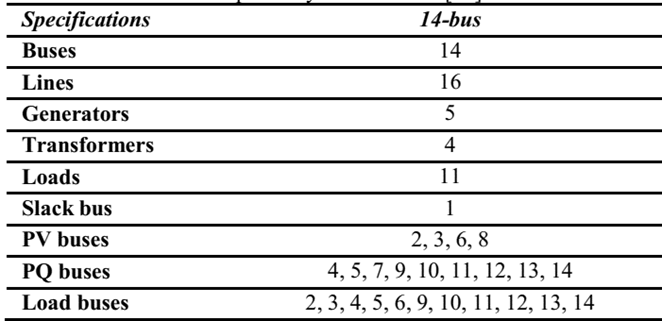 The selected test case was the IEEE 14-bus power system, regarding which general information is shown in Table 1, and the single diagram is shown in Fig. 5[17]. The total real and reactive powers of the load are 392.05 MW and 205.54 MVAr, respectively. The total real and reactive powers of generation are 362.6 MW and 113.96 MVAr, respectively.