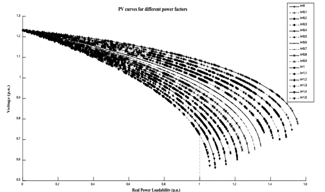 Fig. 6 shows the PV curves created with the NSPF, considering the multiple variations in the real and reactive powers of loads and generators. All the points are plotted simultaneously by calculating random values, and then they are classified according to the relationship between real and reactive powers (k = Q/P), which can vary between 0 and 1.5. Similar curves can be created for different buses, areas, and the power system as well as to evaluate multiple contingencies in the power system.
