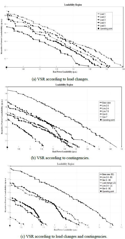 Fig. 7(a) shows that new VSRs can be obtained after load and generation change. We formed PQ curves for five load and generation change cases, obtaining the VSL that evaluates the risk of the changes in the same iteration process. This is useful to evaluate how each loadability change can affect the operation of the power system. The importance of this method is that different directions of loadability for each bus can be programmed to evaluate how the different load changes affect VS. In this figure, some load changes result in the operating point coming closer to the VSL.