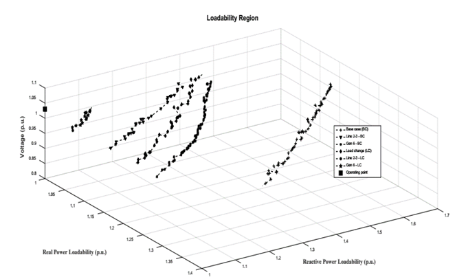 Finally, Fig. 7(c) shows the operation behavior under two load study cases and two contingencies in the power system. The first load case is the power system without modifications (the base case). The second load case is a random load increase represented by the maximum and minimum individual load changes in real and reactive powers. The curves show that load 2 is more critical for operation because the outage of line 2-3 is a critical case for voltage collapse, followed by the risk that represents the output of generator 6. In the same way, multiple loadabilities can be studied to determine those most critical for the network.