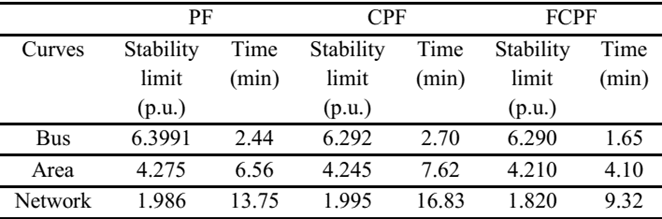 Table 2 shows a comparison of the PF, CPF, and NSPF to assess the critical VSL in a bus, area, or the power system. To perform this comparison, it was necessary to define a few previous operation cases to solve them by conventional methods because these methods do not automatically perform all possible cases according to the power changes. For the study, we consider bus 14, for the area buses 12, 13, and 14, and for the power system all loads (load buses are shown in Table 1). We also considered finding 200 points for the bus, 600 points for the area, and 1,200 points for the power system.