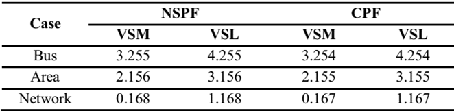 Table 2 shows that the NSPF method obtained the most critical limits that represent the operation risk, and the execution times were shorter. The PF and CPF methods take longer to find closer values because the search for the solution is limited to the rank that the user defines and the increasing power of loads is fixed. For a single bus, the calculation times do not differ much; however, when the problem becomes larger, the number of combinations makes a big difference in the solution time. With respect to the VSLs, the three methods have similar results because the search is focused on a selected and limited zone; however, when the size of the problem increases, the PF and CPF algorithms take a long time to find similar solutions.