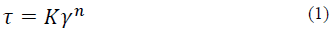 Where τ (Pa s) is shear stress, K (Pa sn) is the consistency index, γ ̇ (s-1) is shear rate and n (dimensionless) is the flow behavior index.