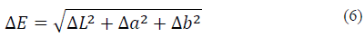 The subscripts 1 and 2 serve to designate the two moments of the determination of the colors (initial and final) between which the color difference ΔE is calculated. In addition, the intensity of the color chroma (C*) was calculated with the eq. (7) and hue tone (h°) with eq. (8).