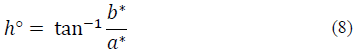 Where α* represents chromatic coordinate red/green and b* is the chromatic coordinate blue/yellow.