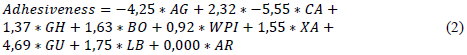 The polynomials with the highest adjustment, which describe the behavior of the response variables according to the composition of the mixture and its ANOVA, are presented in Table 2, Eq. 1 (firmness) and Eq. 2 (adhesiveness):