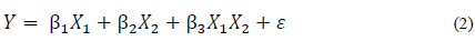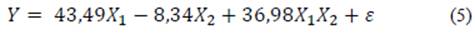 Donde Y es la variable de respuesta “resistencia a la compresión”; β (s) son los coeficientes del modelo determinados por el método de mínimos cuadrados; X1 representa OPC y X2 representa a RM; X1X2 es el efecto de la interacción, y ε es el error experimental.
