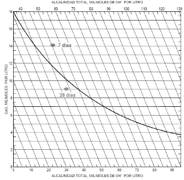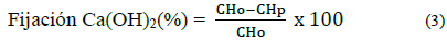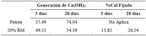 En la Tabla 5 se registran los resultados obtenidos de la Ecuación 3; en esta se aprecia que sí se presenta una fijación de la cal en las pastas con RM, que aumenta desde 13.82% a los 3 días de curado a 26,54% a los 28 días de curado.
