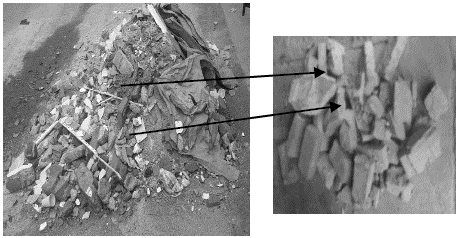 El residuo de mampostería empleado como material cementicio suplementario procedió de la demolición de varias viviendas unifamiliares. Para su empleo el RM se separó de los otros residuos de demolición como plástico, papel y baldosas (Fig. 2). Posterior a ello, la reducción de tamaño del residuo se desarrolló en dos etapas; en primera instancia los trozos de RM se introdujeron en una trituradora de mandíbula y posterior a ello, se molieron en un molino de bolas. Cuando el RM se adecuó para su empleo, se procedió a determinar la composición química y tamaño de partícula, los cuales se presentan en la Tabla 1