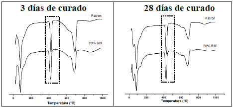 La disminución de la portlandita puede observarse en los resultados cualitativos del pico correspondiente a la deshidroxilacion del Ca(OH)2. La cal fijada (Ca(OH)2 (%)) puede ser calculada empleando la ecuación 3 [24,34,35].