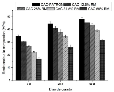 Los resultados de resistencia a la compresión de las mezclas se muestran en la Fig. 5. La incorporación del 12,5% a 50% en volumen del RM en las mezclas de CAC generó una pérdida del 12,7% a 51,5% a los 7 días de curado, la cual se hace mayor a medida que aumenta el porcentaje de reemplazo. Pero esta diferencia disminuye a los 28 días ubicándose la perdida de resistencia en 7,39% a 41% en comparación con el CAC Patrón (sin presencia de RM). Esto es debido probablemente a la lenta reactividad que presenta el RM, ya que a los 60 días de curado, la discrepancia del CAC Patrón y los CAC con RM es menor encontrándose entre 5,6% a 34,2% para el menor y mayor porcentaje de sustitución respectivamente.