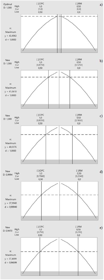 En las Fig. 6, a,b,c,d y e se muestran las diferentes predicciones de la resistencia a la compresión, para distintos valores de OPC y RM. En el cual es posible predecir los siguientes resultados: