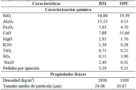 El cemento Portland (OPC) de uso general empleado en este estudio se adquirió de una planta local de Colombia. La composición química se determinó mediante fluorescencia de rayos X empleando un Espectrómetro Phillips MagiX-Pro PW-2440, y el tamaño de partícula se determinó empleando un granulómetro laser Mastersizer-2000 de Malvern Instruments. Los resultados se muestran en la Tabla 1.