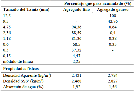 Arena de rio y grava triturada con una gradación continua se utilizaron como agregados. La distribución de partículas y propiedades físicas se registran en la Tabla 2.