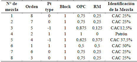 Se utilizó un diseño de experimento de mezclas, específicamente de vértices extremos, el cual tiene la característica de abarcar un menor espacio dentro de la superficie de experimentación, debido a las restricciones de las componentes. Con el fin de determinar el porcentaje óptimo de reemplazo de RM por OPC para obtener el CAC con una resistencia a la compresión de 38 MPa, con el mayor porcentaje de reemplazo de este residuo. La Tabla 3 presenta las mezclas que genera el diseño de vértices extremos para la optimización de la resistencia a la compresión; para ello se requirieron ocho (8) ensayos o mezclas, de las cuales cuatro (4) corresponden al punto central, dos (2) al punto factorial y dos (2) a los puntos axiales.
