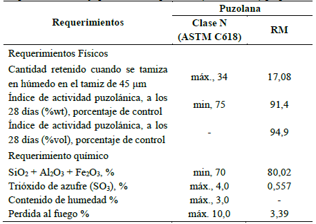 Basados en los criterios de la ASTM C618 [26] se determinó el índice de actividad de resistencia, el cual se llevó a cabo a los 28 días de curado. De acuerdo con la Tabla 4, el RM cumple con el requerimiento de ASTM C618 [26]. El índice de actividad de resistencia varía cuando se reemplaza el 20% del OPC en peso o volumen. Cuando el reemplazo se realiza en volumen se obtuvo un mayor SAI en comparación a cuando el reemplazo se realiza en peso, sin embargo, ambas mezclas cumplieron satisfactoriamente con la ASTM C618 [26], ya que el SAI obtenido fue mayor al establecido en esta (˃75%) (Tabla 4). Además, se puede apreciar que el RM también cumplió con el requerimiento químico de la suma de los componentes SiO2 + Fe2O3 + Al2O3 ya que este presenta más de un 80% de estos compuestos (Tabla 4).