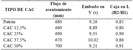 En general, se observa que todas las mezclas presentaron propiedades aceptables en estado fresco cumpliendo las especificaciones para ser considerado como CAC.