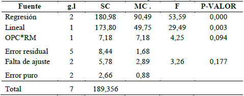 En la Tabla 7, se presenta el análisis de varianza de la resistencia a la compresión, en la cual se obtuvó que a un nivel de significancia del 0,17 el modelo planteado es adecuado, siendo igualmente significativa la regresión que incluye el efecto lineal y la interacción a un nivel de significancia de 0,000. Con este modelo, se obtuvo un coeficiente de determinación de 95,54% (R2), siendo esta una buena medida de la variación del ajuste de los datos al modelo planteado para la resistencia a la compresión (Y) asociado con las componentes OPC y RM.