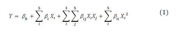 The actual and coded levels of the independent variables are given in (Table 1), and second-order polynomial equation which includes all interaction terms was used to calculate the predicted response in the following eq. (1).