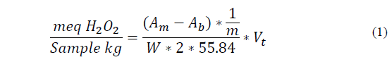Where, Am and Ab are sample absorbance and blank, respectively, m is the slope of calibration curve (μg/mL), W is the sample weight (g), Vt is the final volume (mL) of reaction mixture; 2 is the conversion factor to express meq H2O2, and 55.84 is the molecular weight of iron (μg/μmol).