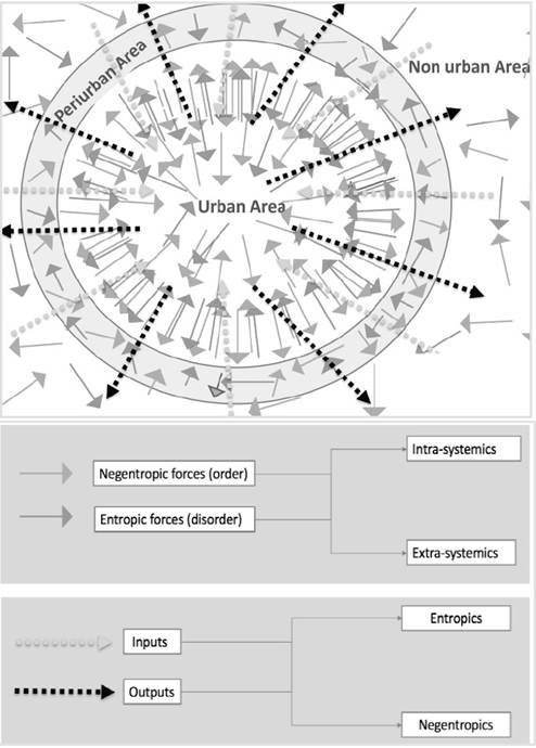 a) Firstly: it was done a description of the relationship between the system and its surroundings with the entropy and negentropy intra-systemic and inter-systemic, due to “(…) is accepted that from its surroundings (beyond the city limits) come in and go out currents of matter and energy with direct impact on the city’s gestalt” [14].