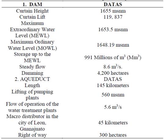 This dam aims to minimize temporarily the water requirements for part of the cities of León in Guanajuato and Los Altos and Guadalajara in Jalisco, Mexico (Table 1). The area of the basin that circumscribes the project is 17,775 km2, average runoff annual of 440 millions of cubic meters, flow average of 13.95 m3/s, pourer of the mixed dam (Reinforced concrete face and concret compacted with roller) of 200 meters long and designed in free crest with jump sky and buffer tank [11-12].