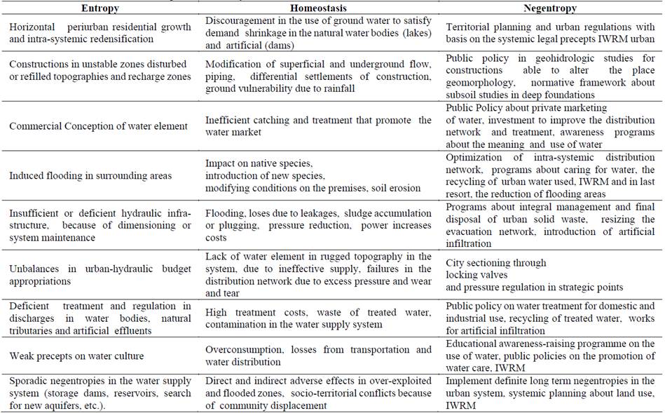 The urbanization of the support systems pushes on one side the homeostasis of the natural processes of the hydraulic cycle like the infiltration of water runoff into the subsoil, but also the depletion of phreatic bodies, due to the unreasonable extraction to satisfy public demand added to losses in the distribution network. In this sense, respond to the demand for water with dams, without considering the treatment of water, the recycling of water, the maintenance of the water distribution system, the regulations on the water supply and the construction of a culture in the Water use and care will not be sufficient measures to reduce the entropy caused by anthropogenic forces.