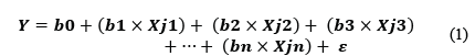 La Regresión Múltiple tiene como objetivo principal encontrar una ecuación que prediga el resultado de una variable dependiente Y, a partir de un número N de variables independientes Xjn. También permite determinar cuál es la variación de la variable dependiente Y con base en las distintas variaciones de las variables independientes Xjn. Los coeficientes bn que acompañan a las variables independientes Xjn se determinan de manera paralela implementando el método de mínimos cuadrados, la expresión general de la regresión Múltiple está dada por la ecuación 1. El término ε es referente al error que pueda darse al momento de realizar variaciones simultaneas en las variables independientes, esto con el fin de obtener una ecuación de manera completa y lo más aproximada posible al modelo que se desea representar.