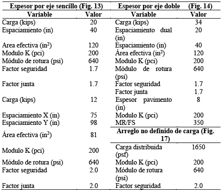 El diseño de pavimentos industriales incluye parámetros como número de repeticiones de carga montacargas, cargas puntuales y cargas distribuidas directamente sobre el terreno y la capacidad de soporte del suelo. Hay diferentes metodologías para el diseño de este tipo de pavimentos [2]. El método de la PCA utiliza los parámetros antes mencionados y con base en una serie de nomogramas permite calcular el espesor de las losas del pavimento. El espesor debe determinarse por fatiga, por carga puntual y por carga distribuida, dependiendo del uso que tendrá el pavimento se pueden descartar algunas de estas tres solicitaciones, sin embargo, para el diseño final se seleccionará el mayor espesor del resultante entre las solicitaciones consideradas.