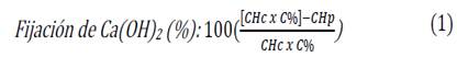 El efecto puzolánico fue analizado a partir del pico 4 de los DTG, mediante la medición del consumo del hidróxido de calcio en la pasta con 20% de RM. Se observa que la mezcla 20% RM presento una menor cantidad de CH en comparación a la mezcla PATRON, este comportamiento se observó a lo largo de todas las edades, confirmando así el carácter puzolánico del RM. La fijación del % de cal se calculó siguiendo la ecuación 1 [36,39].