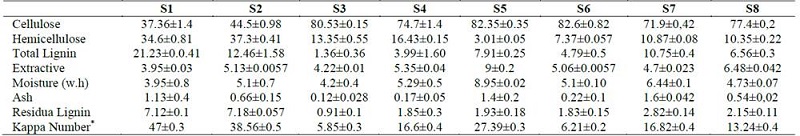 The leaves and top cane of sugarcane crop residues used in this study came from varieties CC 8475, CC 8592 and were supplied by CENICAÑA. These residues were used a few days after being collected. The first substrate (S1) corresponded to the control, which was not subjected to any treatment. Substrates S2 to S8 were pretreated as described in Table1. The moisture content was determined until weight was constant at 105°C, Kappa Number by Tappi Standard T 236-cm-8 and cellulose, hemicellulose, lignin, extractive and ash content were determined by the Van Soest method [25].
