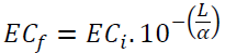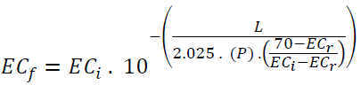 Thus, EC values were calculated using the equations of Volobuyev, Cordeiro, Jury, Hoffman and Reeve, equations 3 to 7, respectively. It is important to note that some equations present the results in electrical conductivity while others present them in ion concentration. In this case, the results in EC were converted into concentration using a correlation between them obtained in the initial phase of the experiment.