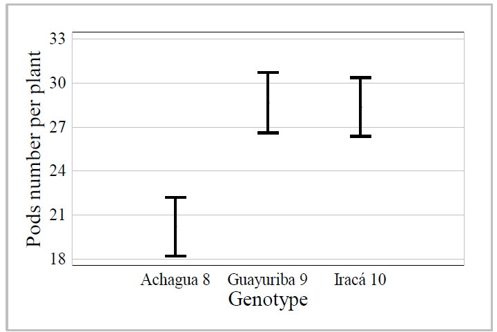 Another indicator of plant stress was the total number of pods per plant, in which the three groups are separated, without interaction between the genotype and the water treatment, although both factors had significant differences. The number of pods for Achagua 8 was significantly lower, compared to the Guayuriba 9 and Iracá 10. This could be due to the fact that it is not the recommended genotype with adaptation to the area of the Piedmont plains. In the description, its strength lies more in the production of pods with a greater number of grains [21] than in generating more pods [22], as shown in Fig. 1.