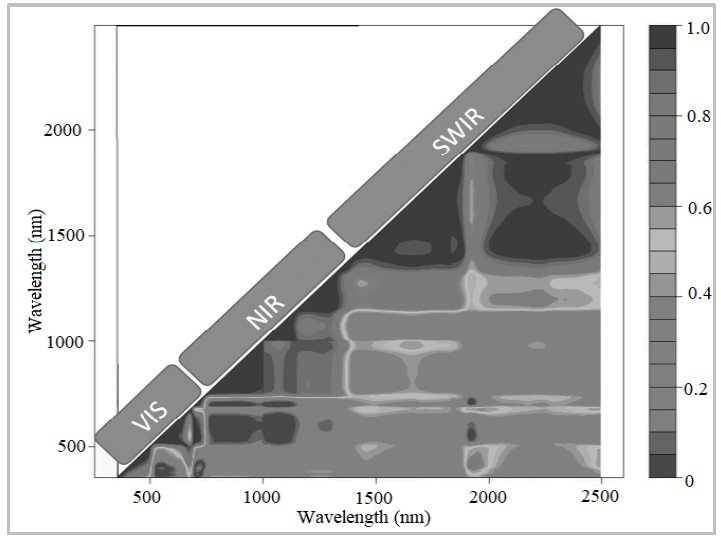 The linear regression coefficient between all the combinations of wavelengths was calculated to explore the correlation and redundant variables. It was observed that with the NIR and SWIR, the consecutive wavelengths were wider than those of the Vis (Fig. 2).