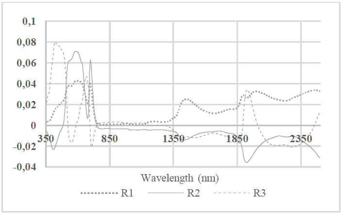 In addition to the calibrations, the dispersion caused by the same measuring instrument must be considered, since the higher the spectral resolution, the higher the relationship between the signal and the noise. Therefore, when using hyperspectral sensors, noise also increases [17].