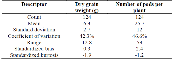 The descriptive analysis is showed in the Table 2. The variation greater than 40% with respect to its mean for dry weight, the bias value and standardized kurtosis are within the expected range for data from a normal distribution. Meanwhile, for the number of pods, the bias is out of range, although the normal distribution is assumed by the amount of data indicated in the central limit theorem.