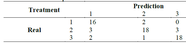 The precision of the model is affected by the range separation of the water content maintained in the soil. In other words, the classification loses efficiency, since treatment 2 is intermediate among the three, which makes it predictable as a sample of treatment 1 or treatment 3.