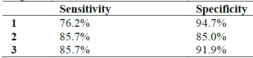 The values of specificity and sensitivity for each group were calculated based on the values predicted by the model. The critical diagnosis situation is that when the plants belong to groups 2 or 3 (soil water content lower than the FC), they are classified by the model within group 1, in which additional water would not be required, thus the results would lead to low production. This means that group 1 must have high specificity to avoid false positives, that is, pods with a need for low water content predicted as if they were in FC. Groups 2 and 3 should have a high sensitivity to avoid false negatives, or pods that have a water content below FC and are predicted in the wrong group (Table 6).