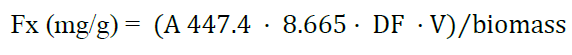 (1)Where Fx had fucoxanthin content, A447.4 was the absorbance of the sample at this λ max, 8.665 was the specific slope of the standard curve, DF was dilution factor of solvent, V was the solvent volume used in mL and finally, the biomass of I. galbana weighted in mg.