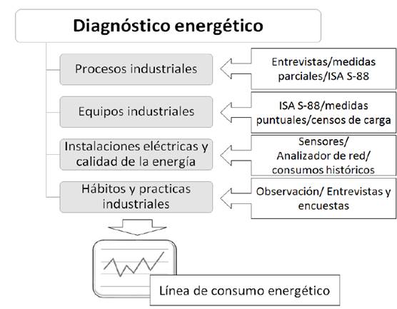 Las AE, se pueden clasificar según los procesos estudiados, el tipo de energético utilizado (Auditoría eléctrica o térmica) así como del alcance de la misma: nivel 1: Revisión rápida de las oportunidades de reducir consumos y costos energéticos, nivel 2: Evaluación detallada de las oportunidades de reducir consumos y costos energéticos, requiere el uso de equipos de medida y su alcance puede abarcar la totalidad de los recursos energéticos de la empresa, o solo un tipo de recurso, nivel 3: Evaluación profunda en una sección específica de la empresa llegando al detalle de toma de registros por equipo, medición de otros parámetros como calentamiento en el sistema de distribución del energético, inventario completo y ubicación en planos de los equipos consumidores de energía, análisis de fallas durante un período determinado y otros análisis que requiera la empresa auditada [24]. En este orden de ideas, las AE de nivel 2 y 3 requieren del desarrollo de un Diagnóstico Energético (DE) donde se hace una caracterización y cuantificación detallada de la manera en que se realiza el proceso de consumo energético en la organización [25]. Tanto la AE como el DE tienen como fin determinar el grado de eficiencia con la que es utilizada la energía y actualmente no se hace diferencia entre las dos y generalmente se omiten algunos elementos importantes que se deben tener en cuenta en el entorno industrial, como los diferentes aspectos que inciden en el consumo energético, que no solo depende de los equipos y la calidad de la energía, sino también de los procesos, hábitos y prácticas industriales. Por ello, es importante plantear para las ESE un procedimiento de recolección y análisis de información global de los diferentes aspectos que inciden en el consumo energético de la industria, que se constituya en una etapa principal para el desarrollo de AE en las empresas industriales.