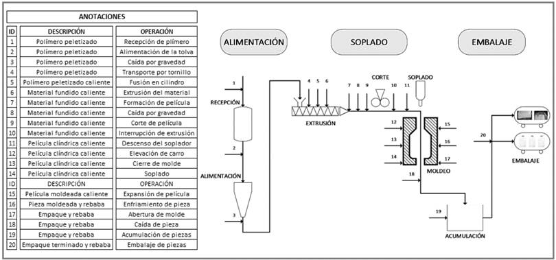 Teniendo en cuenta los tres procesos industriales principales de EPO Ltda., y a partir de visitas a la planta física de la empresa, observar detalladamente el proceso en las respectivas máquinas y entrevistarse con los operarios y el personal pertinente, se obtuvo la información necesaria para realizar el diagrama de flujo de cada proceso. Debido a la complejidad y extensión de los mismos, en este artículo se presenta únicamente el diagrama de flujo por operaciones del proceso de moldeo por soplado, (ver Fig. 4).
