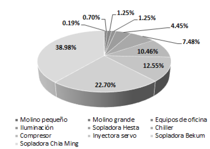 Mediante la instalación de medidores en cada una de las maquinas, se identifican los consumos parciales, donde la sopladora Chia Ming, la sopladora Bekum y la inyectora con servomotor, representan el 74,23% del consumo total de la planta de producción (ver Fig. 6).
