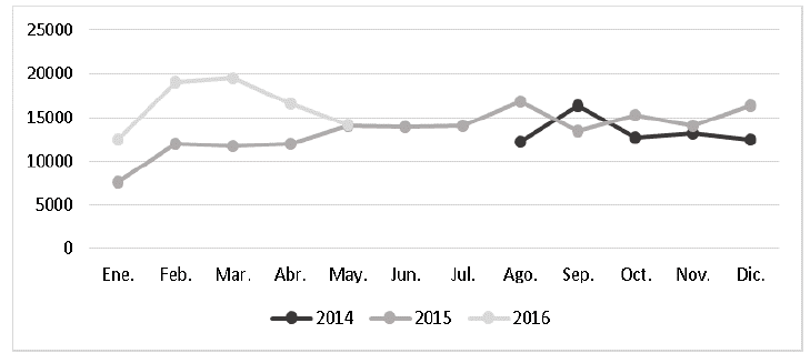 El historial de consumo de energía eléctrica (2014 - 2016), presenta un comportamiento creciente, con un consumo promedio mensual de 14308.33kWh. A principios de 2016 aumentó drásticamente el consumo, (ver Fig. 8), pero debido al deficiente registro de información de producción y del desempeño energético de la planta, no se cuenta con documentación necesaria para comprender las causas de dicho comportamiento.