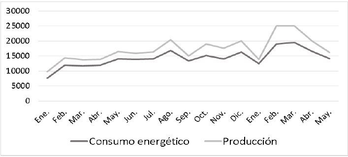 Gráfico de consumo de la energía vs producción: evidencia la cantidad de energía utilizada actualmente en la producción, por lo que los datos de producción deben corresponder con el mismo periodo de los datos del consumo de energía.
