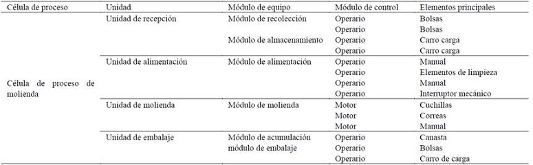 Para el proceso de molienda, el modelo físico tiene 1 célula de proceso, 4 unidades, 6 módulos de equipos, 14 módulos de control (aunque muchos se repiten, se dejaron así para la correspondencia entre los modelos ISA-88.01) y 14 elementos principales (ver Tabla 3).