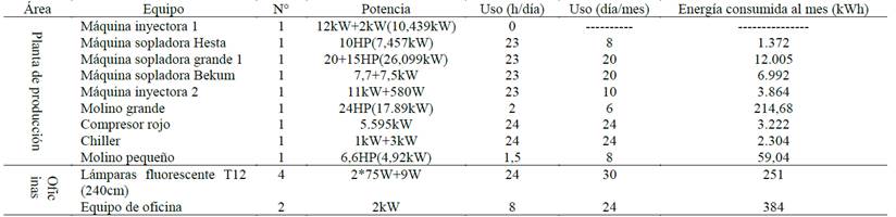 El inventario de los equipos que se encuentran en la planta de EPO Ltda., y su consumo respectivo se encuentra registrado en una tabla que recoge la información del censo de carga, incluyendo la potencia, el consumo promedio que presentan de acuerdo al tiempo de uso y otros datos importantes. En la Tabla 4 se presenta una parte de la información del censo de carga. Se desataca que las nueve lámparas fluorescentes presentan un consumo mensual de 740kWh al mes.