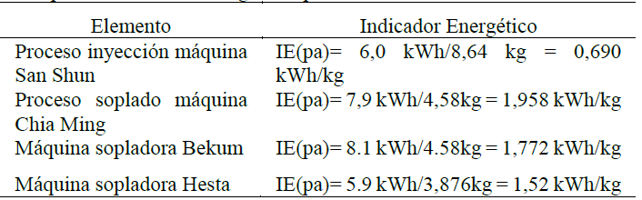 Se plantearon los siguientes IEs: (i) IE de nivel 2 “producción/consumo energético”: relaciona la cantidad de producto procesado por consumo energético (kg/kW), (ver Tabla 5), (ii) IE de nivel 3 “consumo específico para polímeros amorfos semi-cristalinos”. La referencia en consumo energético está entre 0,20 kWh/kg y 0,25 kWh/kg.