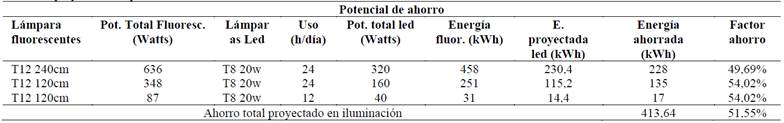 Teniendo en cuenta que en EPO Ltda. el consumo mensual de energía correspondiente al sistema de iluminación es de 740kWh, el cambio de luminarias fluorescentes por luminaria Led, es una acción de bajo costo que puede ser implementada fácilmente y cuyo beneficio se evidenciará inmediatamente. Con el cambio de luminarias, se proyecta un ahorro energético mensual de 413,64 kWh que representa el 51,55% del consumo total del sistema de iluminación de EPO Ltda. (ver Tabla 6).