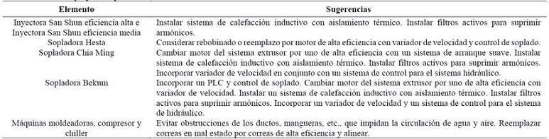 Se propuso una auditoría energética de tipo eléctrica y de nivel 2, orientada al sector industrial, que permite realizar el levantamiento de información de manera organizada y sistemática, un diagnóstico energético detallado y generar acciones enfocadas a mejorar el desempeño energético, alrededor de cuatro ejes: equipos industriales, instalaciones eléctricas y calidad de la energía, procesos industriales y finalmente, hábitos y prácticas industriales. Se aplicó a una empresa del sector plástico, permitiendo conocer aspectos de la problemática energética nacional que enfrenta la industria; y concibiendo que en muchas organizaciones no prima la solvencia económica, resulta determinante mejorar continuamente los procesos, el desempeño energético y reducir costos operacionales, para mantenerse a flote bajo las exigencias del mercado. Finalmente, se implementaron una serie de acciones con las que se consiguieron mejoras en la producción y en la EE del 7,25% en EPO.